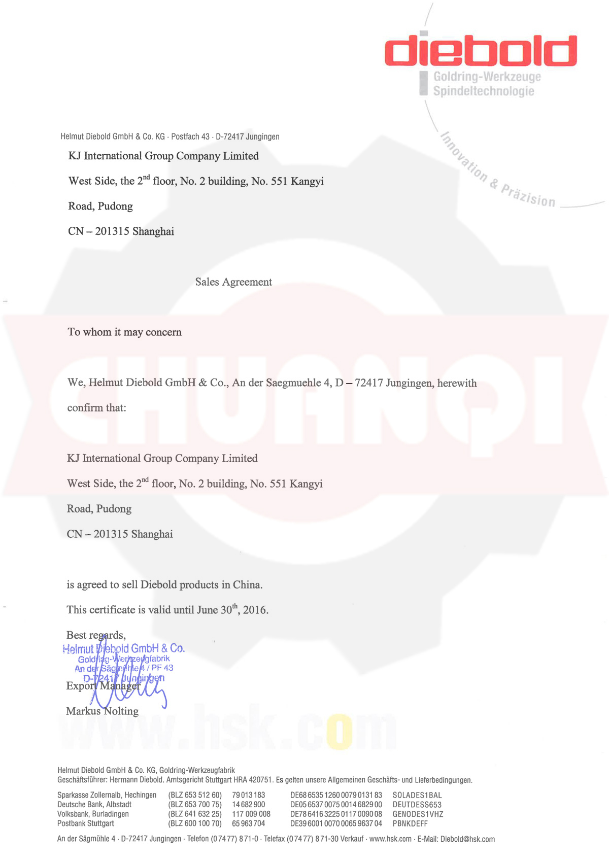 德國(guó)Diebold代理證書(shū)